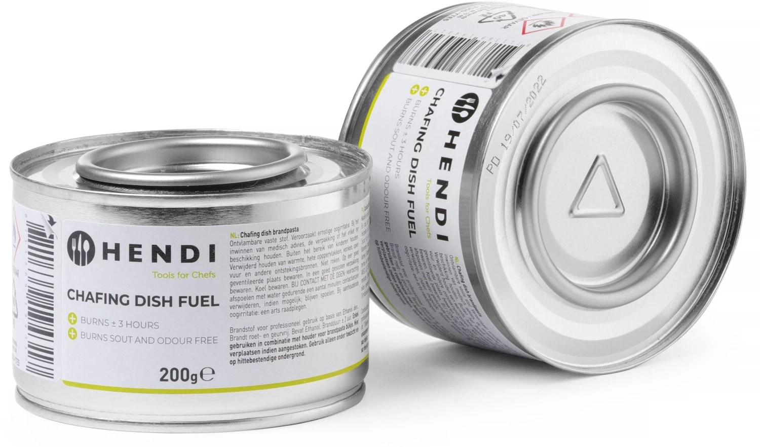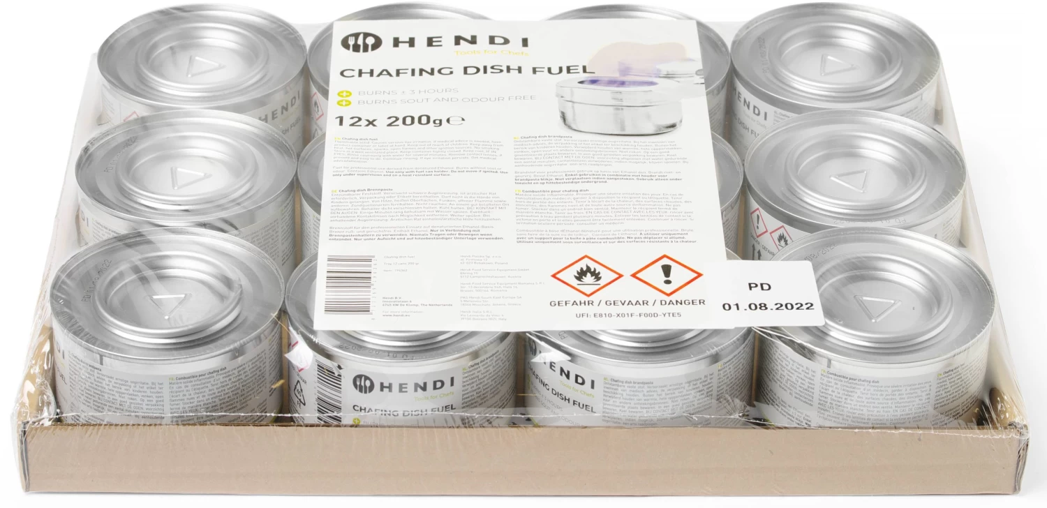 Hendi Brandpasta is gemaakt van natuurlijke (bio) ethanol alcohol, gemengd met water en een verdikkingsmiddel. Brandpasta wordt kunstmatig zo bitter gemaakt dat het niet doorgeslikt kan worden. Om chafing dishes (warmhoud bakken) te verhitten heeft u speciale brandpasta houders nodig. De brandduur is ongeveer 3 uur.